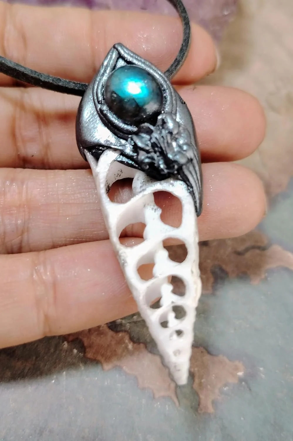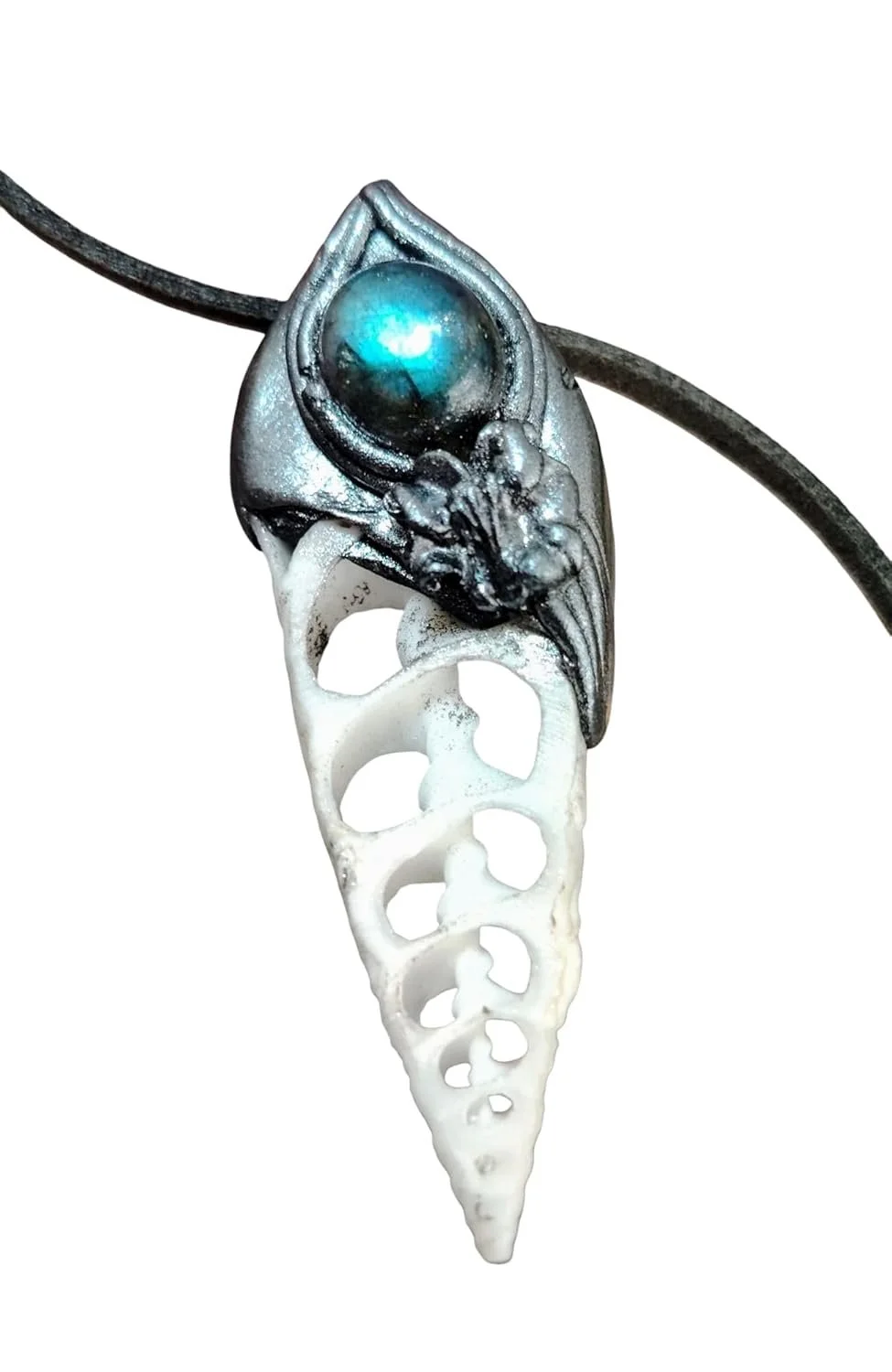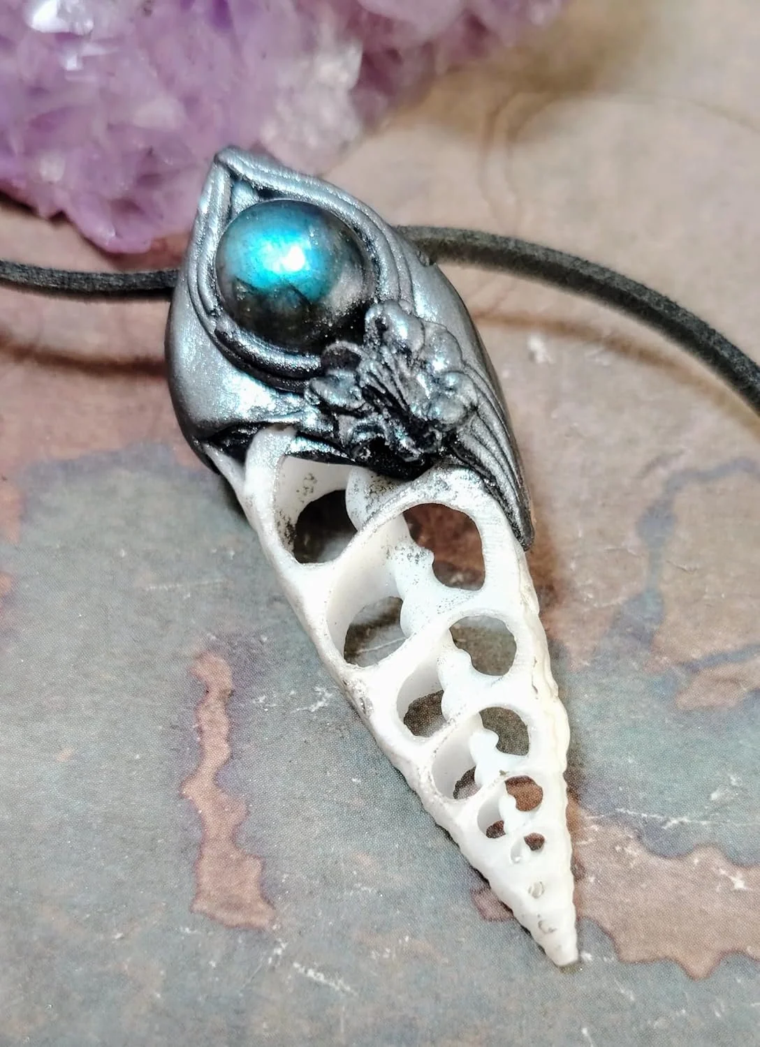 The Selkie, is a unique natural sea shell, labradorite and clay crystal pendant.